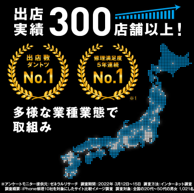 全国300店舗以上の店舗網にてiPhone・iPadを中心に最短30分、即日修理サービスを展開しております。